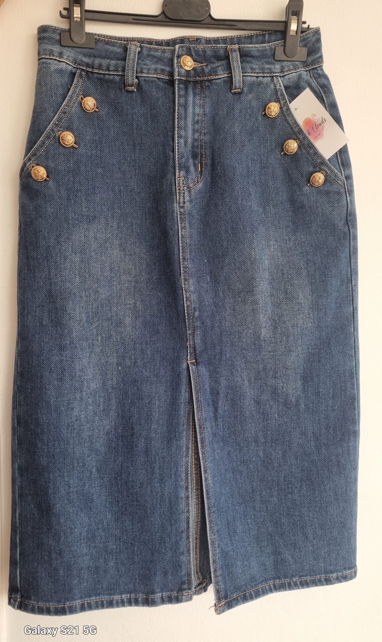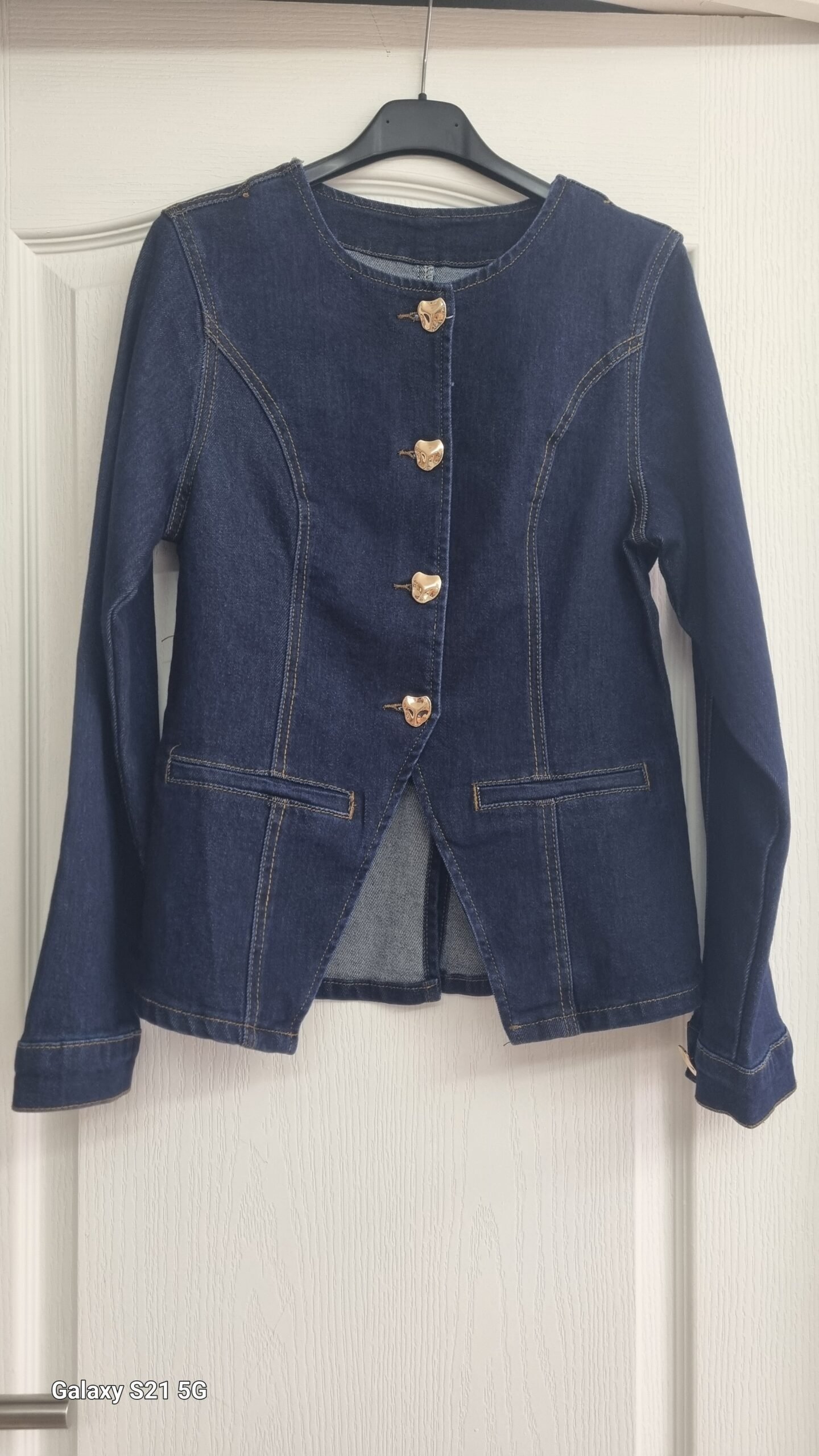 Chaqueta vaquera de estilo clásico y retro con un corte nostálgico .Cuenta con un cuello tradicional ,cierre de botones y bolsillos frontales en el pecho y laterales . Material : una mescla de  algodón ,elastán y poliéster.