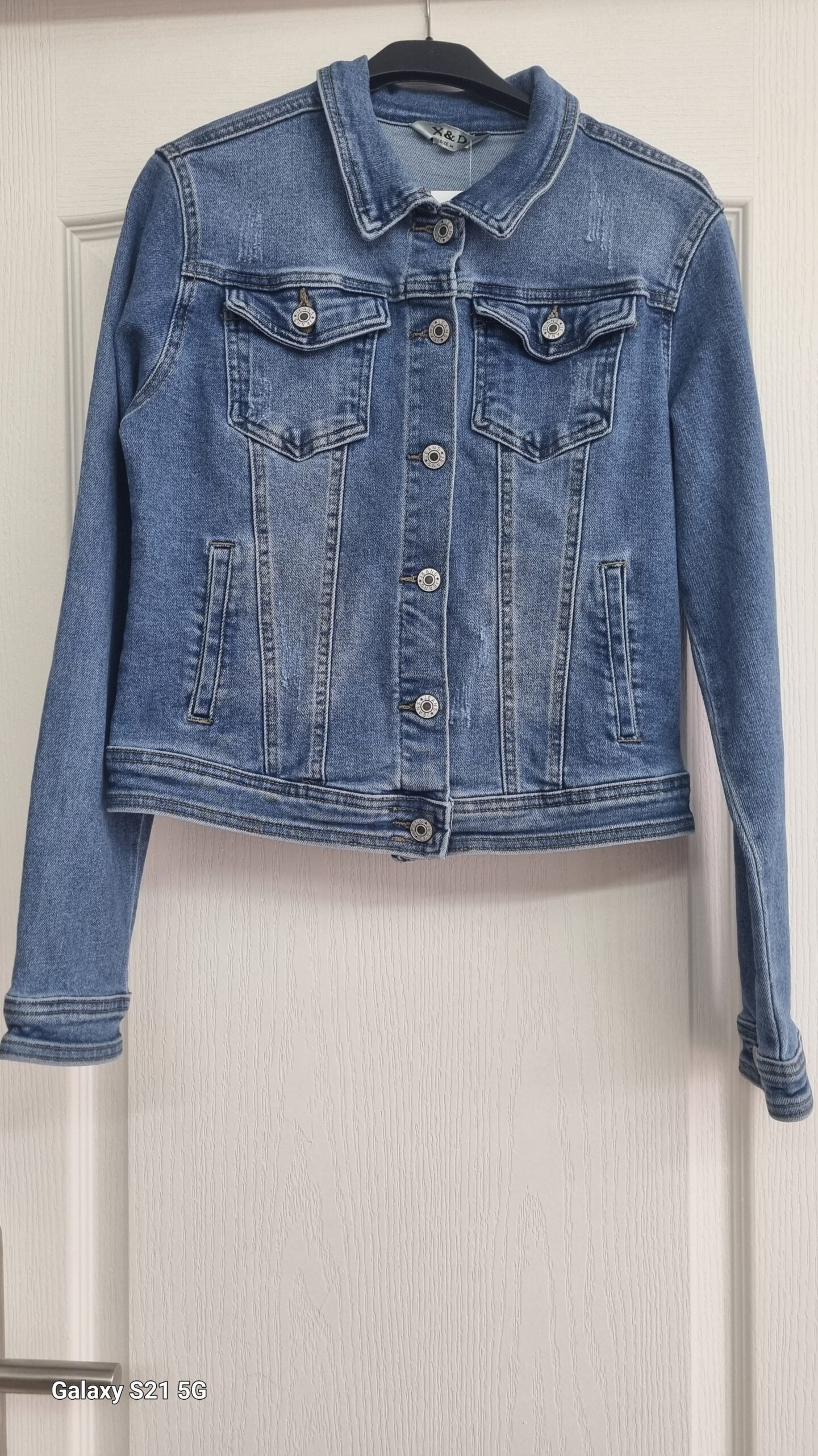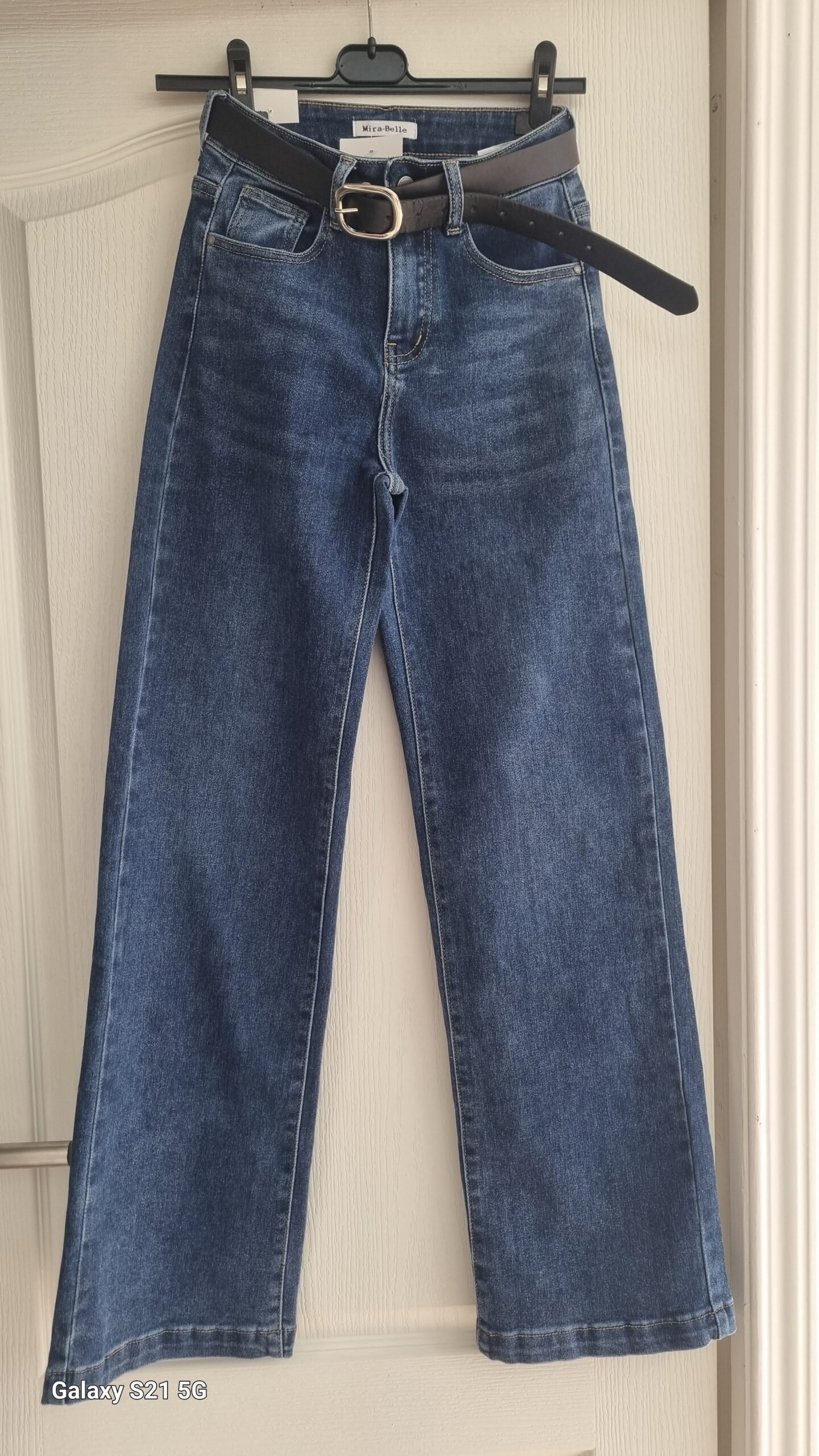 falda vaquera con un corte recto, bolsillos laterales con botones dorados, lleva una abertura en la parte delantera, color azul