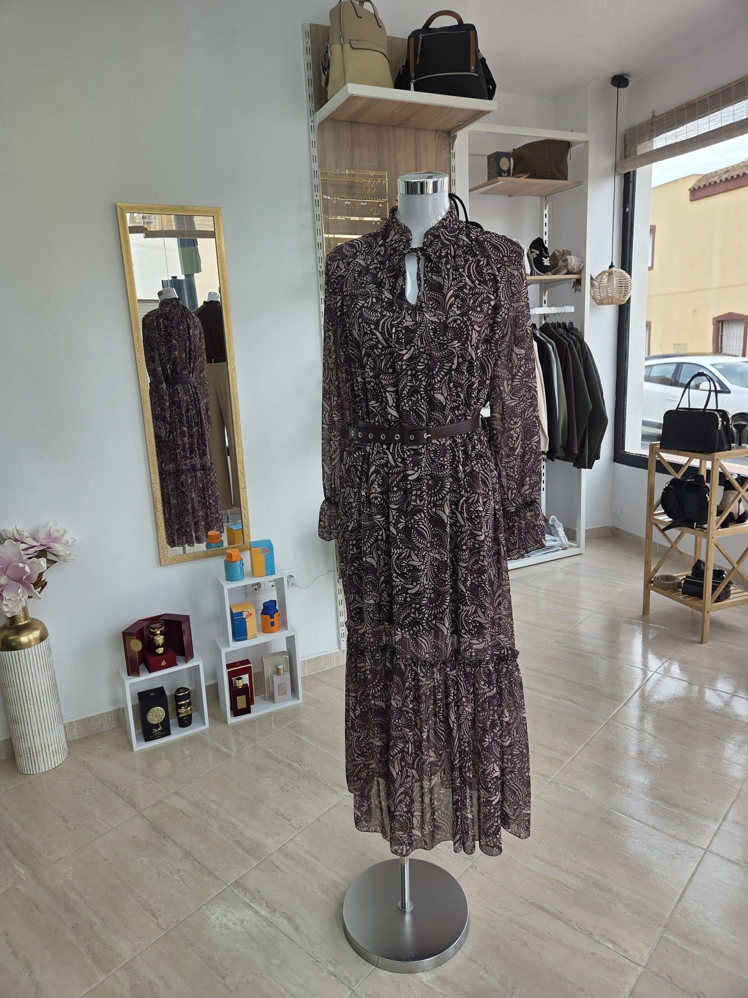 Vestido de punto midi de maga larga con volantes en los hombros y detalles con botones decorativos . Diseño que realza la silueta , tejido de canalé elástico y cómodo . Tacto suave .Longitud midi lo que significa que el dobladillo cae entre la rodilla y el tobillo .el corte es entallado al cuerpo.